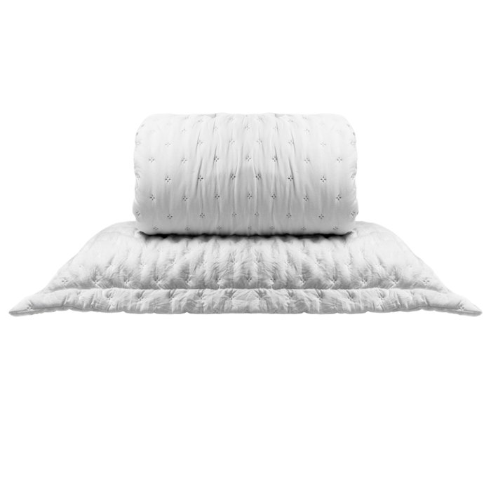 Uma colcha para cama de casal nas dimensões 240x260cm, acompanhada por duas capas para travesseiros brancas, oferece uma combinação perfeita de funcionalidade e elegância. Feita com fibra reciclável este produto é uma escolha sustentável !