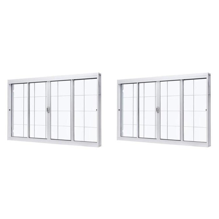 Kit com 2 Janelas de Aço de Correr Central 100x150cm 4 Folhascom Grade Quadriculada e Vidro Liso Branco