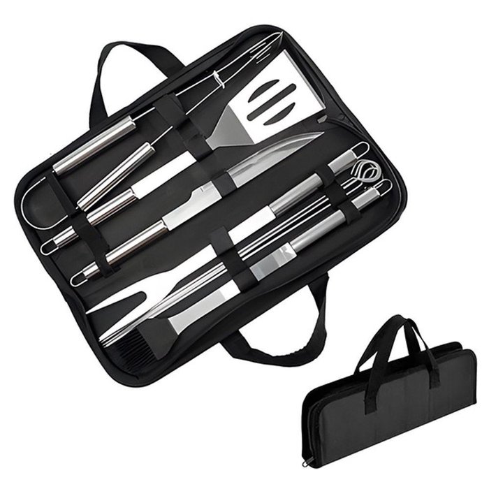 Confira o Kit Churrasco ideal para quem valoriza praticidade e qualidade na hora de preparar refeições. Composto por 9 itens produzidos em aço inoxidável de alta durabilidade, este conjunto oferece precisão e eficiência nos cortes, garantindo que o preparo do seu churrasco seja feito da melhor forma possível. Além de funcionais, os utensílios vêm acomodados em um estojo com alça resistente e elegante, facilitando o transporte e o armazenamento, seja em casa, no sítio ou em um churrasco com amigos. Especificações: Material: Aço inoxidável; Estojo com alça em nylon. Itens Inclusos: - 1x Garfo em inox; - 1x Faca em inox; - 1x Espátula em inox; - 1x Pegador em inox; - 1x Pincel com cabo em inox; - 4x Espetos em inox; - 1x Estojo com alça. ATENÇÃO: Matenha esse produto LONGE do alcance de CRIANÇAS, pois há itens pontiagudos e de corte!