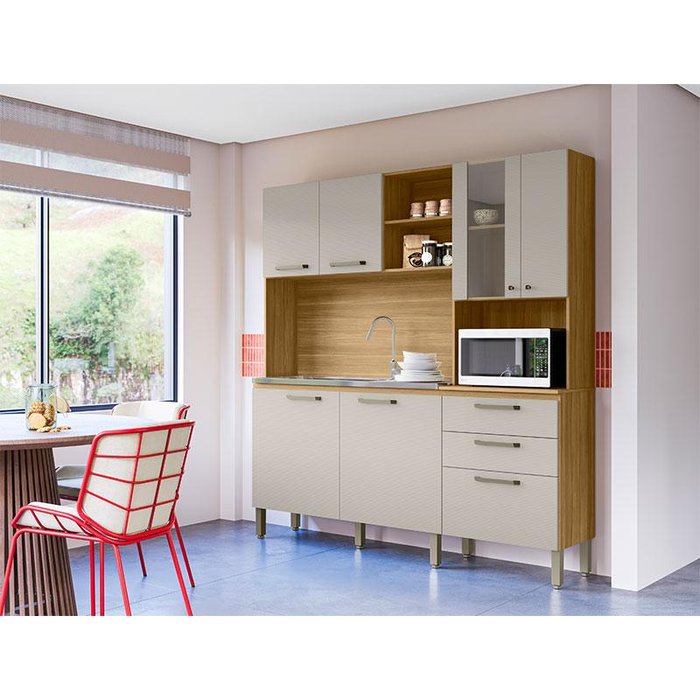Está montando sua cozinha? Apresentamos para você este belo kit cozinha da linha Mega. Com sete portas, sendo uma delas com vidro, dando elegância. Possui duas gavetas com corrediças telescópicas garantindo um deslizamento suave. Equipado com um nicho micro-ondas, três nichos para acomodar itens menores, e espaço para acomodar cuba de pia. Os puxadores em poliestireno e os pés reguláveis são em polipropileno, proporcionando mais durabilidade. Desenvolvido em MDP, é fabricado pela Kits Paraná, perfeito para quem busca praticidade e funcionalidade. Confira e aproveite!