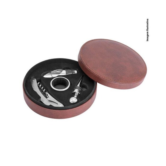 Kit de Vinho com estojo em couro e com 04 Peças - ideal para presente. O estojo em couro permite que você decore seu ambiente com muito luxo e elegância, além de abrir e curtir o vinho com todos os seus componentes. O kit é composto por 01 canivete saca-rolhas, 01 bico dosador, 01 anel salva-gotas, 01 tampa de vinho, tudo isso acomodado dentro de um lindo estojo em couro.