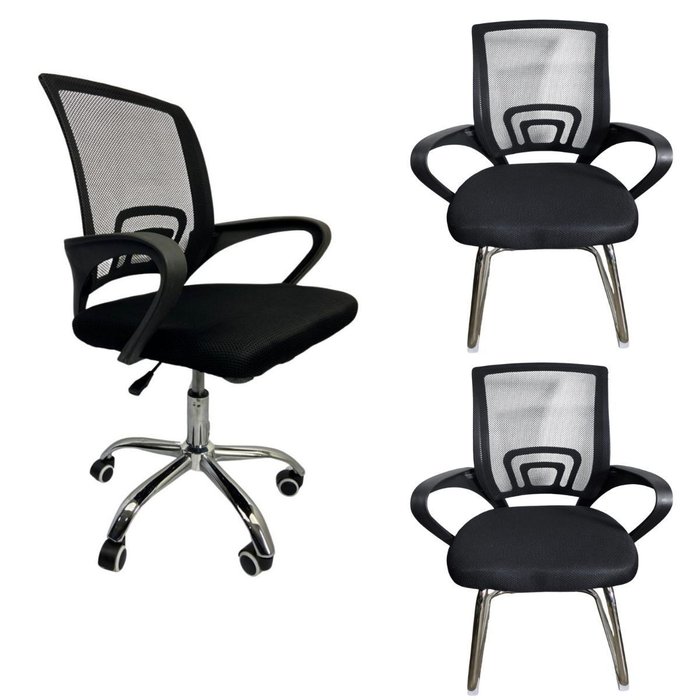 Kit Escritório Cadeira Tela Mesh 2 Cadeiras Base Fixa + 1 Cadeira Giratória com Rodízios