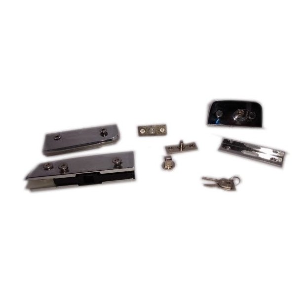Kit ferragem para porta pivotante de vidro temperado, ideal para instalação de porta de vidros temperado blindex. Sistema: Santa Marina Uso: Portas simples e portas com mola de piso Aplicação: Porta pivotante vidro alvenária Cor: Cromado Contém: 1x dobradiça superior 1x dobradiça inferior 1x pivô superior 1x pivô inferior 1x fechadura 1x contra fechadrua vidro/ alvenária OBS: Detalhamento de recortes necessário para o uso do kit na segunda imagem.