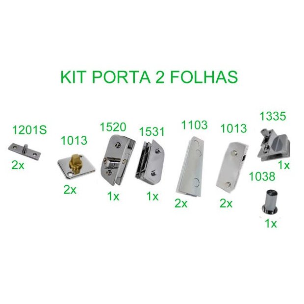 Kit porta de giro dupla em vidro temperado que utilizam o padrão "Santa Marina". O kit serve para apenas 1 porta dupla. Contém: 1013 - 2 unidades - Dobradiça superior 1103 - 2 unidades - Dobradiça inferior - Sistema tradicional 1520 - 1 unidade - Fechadura 1531- 1 unidade - Contra-fechadura com aba 1335- 1 unidade - Trinco 1038 - 1 unidade - Copinho 1013 - 2 unidades - Pivô inferior para mola - Sistema tradicional 1201S- 2 unidades - Pivô superior (Sistema invertido) Cor: Cromado Trabalhamos com diversos tipos de ferragens nos consulte no campo perguntas caso tenha interesse em algum outro item para vidro temperado padrão "Santa Marina" e "Blindex". Demarcos Engenharia agradece