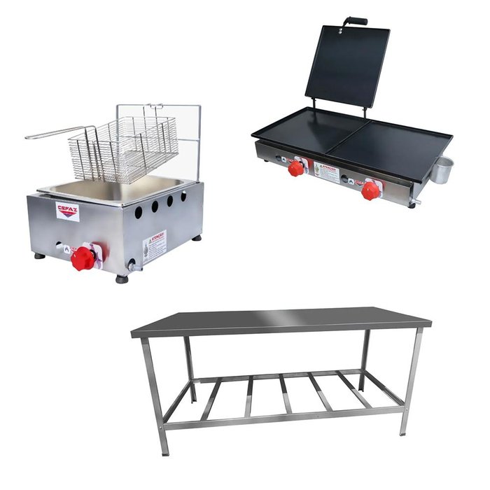 Esse Kit conta com Mesa de Manipulação para você preparar os alimentos, Fritadeira para fritura de suas porções e uma Chapa para preparação do seu cardápio!