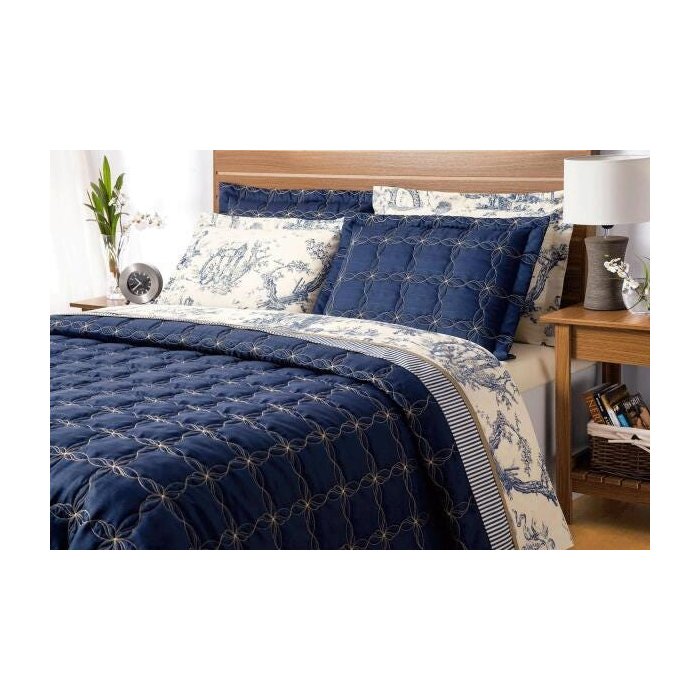 Kit Porcelana Cobre Leito Colcha e Jogo de Lençol para Cama Casal Queen Super Luxo com 7 Peças azul marinho/palha