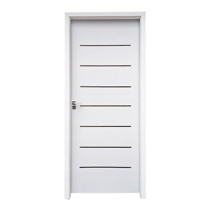 Porta Cristal Primer com estrutura de madeira de reflorestamento e colmeia Honeycomb, leve e resistente. Acabamento em primer branco para fácil pintura. Inclui batente em pinus, fechadura roseta Modena em aço escovado e dois jogos de guarnições. Ideal para personalização, com estilo e sustentabilidade.