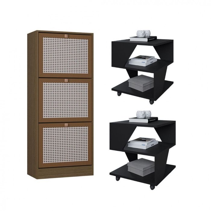 Kit Sapateira Spin Tropical 3 Portas e 2 Mesas de Cabeceira/centro Poquema Preto/Carvalho