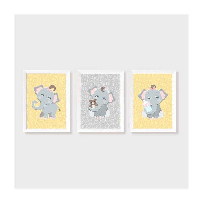 Descritivo: Kit Três Quadros Elefantes Amarelo