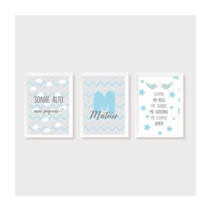 Quadro Menino, kit de três (3), nas cores azul, cinza e branco. Nome de acordo com o Bebê, Frases "Sonhe alto Nosso pequeno" e "Santo Anjo".