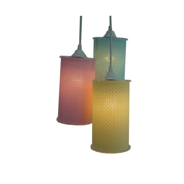 Lustre pendente com 3 cúpulas cilíndricas revestidas com tecidos estampados arabescos.