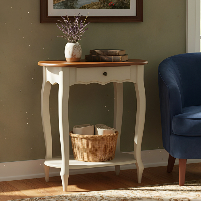 Mesa de Apoio Oval Clássica Decorativa de Madeira com Pés Luiz Xv - Branco Laca com Tampo Imbuia Gla