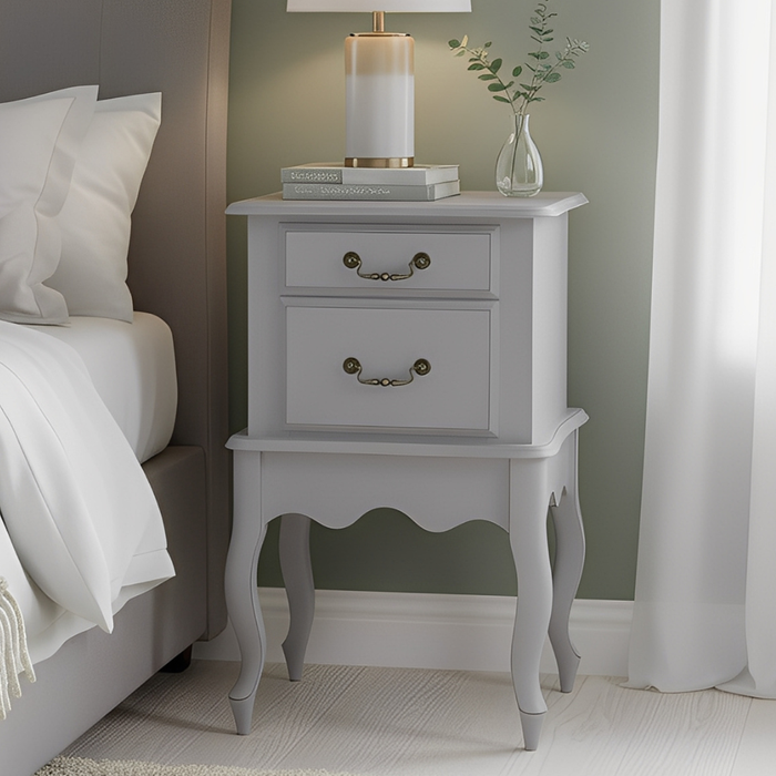 Mesa de Cabeceira Clássica com 2 Gavetas e Pés Luiz Xv - Cinza Laca