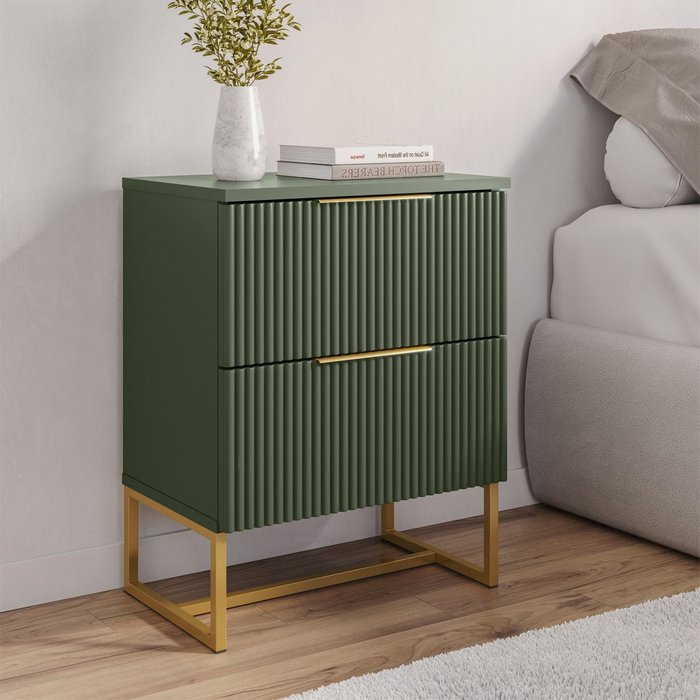 Mesa de Cabeceira Lumia com 2 Gavetas Detalhe Ripado Base de Aço Industrial - Verde/ Pé Dourado