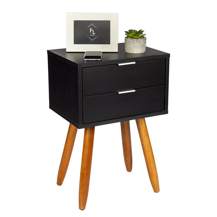 Mesa de Cabeceira Retrô 40cm Preto 2 Gavetas Pés Palito Madeira Maciça - Enviamos Montado