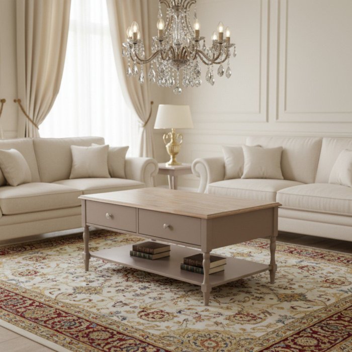A mesa de centro combina elegância clássica e funcionalidade para complementar sua sala de estar com charme e praticidade. Com tampo em madeira maciça escovada, que traz um toque acolhedor e sofisticado, e estrutura em acabamento fendi, o design remete ao estilo tradicional com leveza e delicadeza. Possui duas gavetas espaçosas, além de uma prateleira inferior que amplia o espaço de organização. É ideal para compor ambientes aconchegantes e elegantes. Uma peça versátil, que harmoniza facilmente com diferentes estilos de decoração.