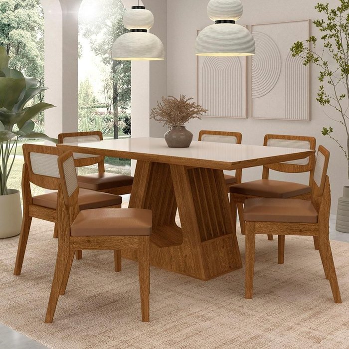 Mesa Santiago com 6 Cadeiras Sextavada Frei/off/corino Caramelo - M.a Freijó/off Pre/corino