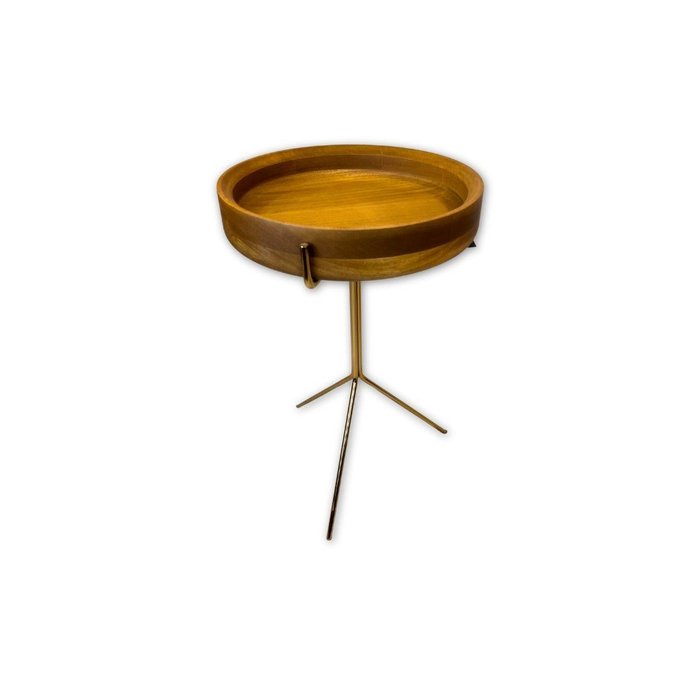 Mesas Laterais Live – Madeira Maciça e Estrutura Dourada com Design Escultural Alta - Com tampo em bandeja de madeira natural e base metálica dourada, a Live é a escolha perfeita para quem busca sofisticação funcional.