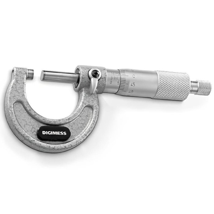 Micrômetro Externo 0 a 25 mm 110.100 DIGIMESS O Micrômetro Externo é ideal para quem procura um acessório que ofereça medições precisas e ágeis, possibilitando assim medições mais rigorosas e precisas que um paquímetro. Possui arco fabricado em ferro fundido nodular, pintado e esmaltado, com tambor, bainha e catraca em metal cromado fosco. Faces de medição em metal duro micro lapidadas, a pressão de medição é através de catraca na extremidade do tambor. Haste padrão para zeragem nas capacidades acima de 25mm e graduação de 0,01 mm.
