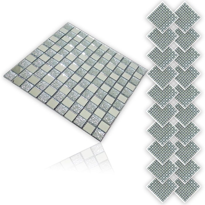 Transforme seus ambientes com esta pastilha decorativa feita de vidro verdadeiro, combinando brilho, textura e um visual moderno. O design em padrão geométrico cria um efeito visual sofisticado, com peças retangulares em tom prata e detalhes texturizados que adicionam profundidade e requinte.