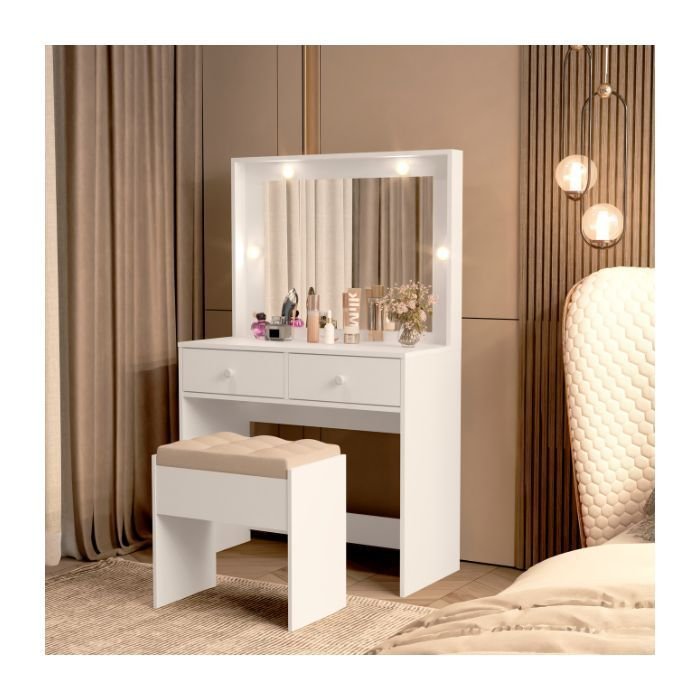 • Possui 2 gavetas espaçosas, perfeitas para acomodar cosméticos, acessórios e itens pessoais, mantendo o ambiente organizado e elegante.
