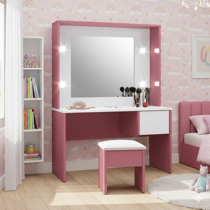 Imagine a expressão de encantamento no rostinho da sua pequena princesa ao descobrir seu próprio espaço de beleza, iluminado por luzes suaves que fazem cada momento de brincadeira parecer mágico. Esta penteadeira infantil não é apenas um móvel; é um portal para o mundo da fantasia, onde ela pode se imaginar uma verdadeira princesa, explorando sua criatividade e autoexpressão. Com design encantador em rosa e branco, ela transforma qualquer cantinho do quarto em um reino de faz-de-conta e alegria.