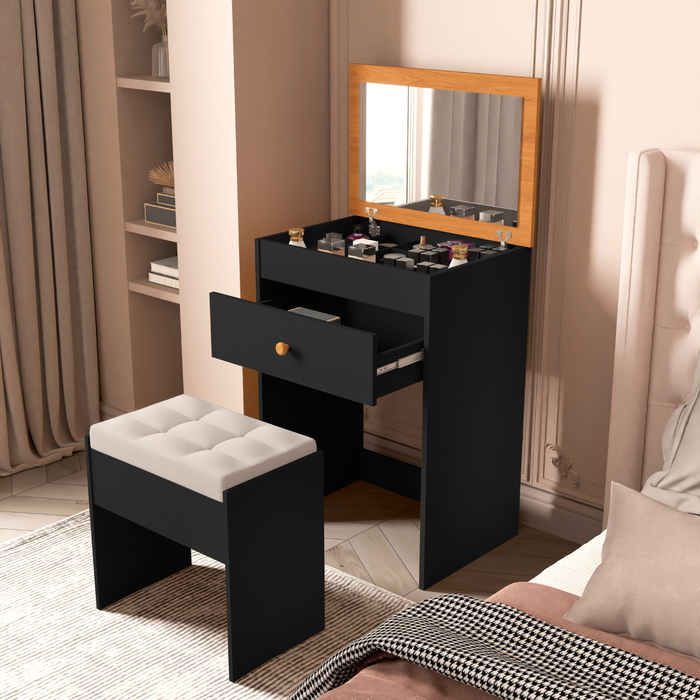 CONJUNTO COMPLETO: Penteadeira, espelho, gaveta e banco. Tudo que você precisa em um único kit.