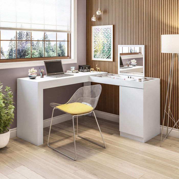 Penteadeira e Escrivaninha Organizadora de Canto Star com Espelho Makeup Cor Branco Liberty Móveis