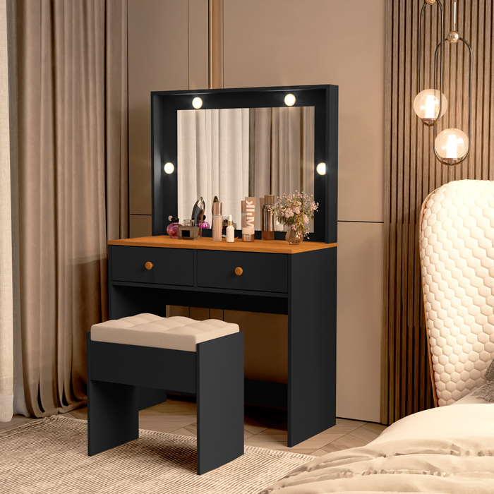 Itens Inclusos Penteadeira, Espelho com LED, 2 Gavetas, Banco