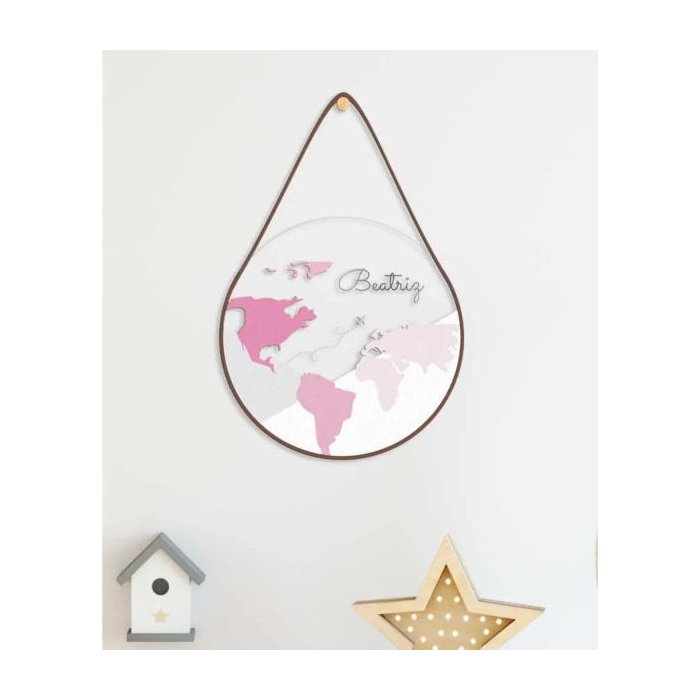 Placa de Acrílico Transparente com Nome 3D Mapa Mundi Rosa