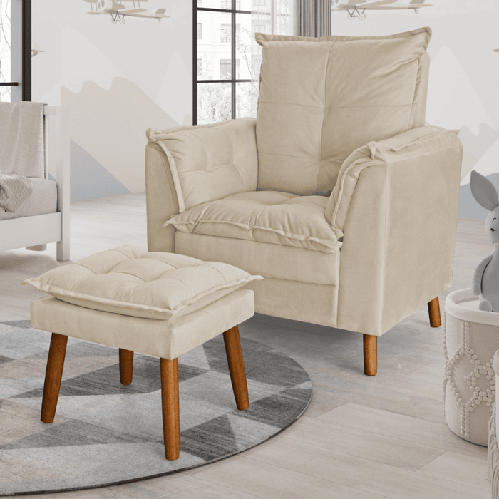 Poltrona Amamentação Descanso Pés Palito com Puff Ariel Suede Bege Bege