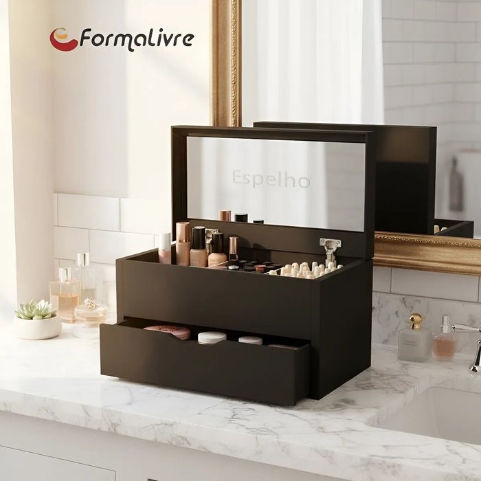 Porta Maquiagem Caixa Organizadora com Espelho Preto Laca