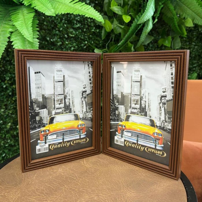 Porta Retrato Duplo Vertical em Madeira Detalhado 15x21 Luxo:marrom Ripado