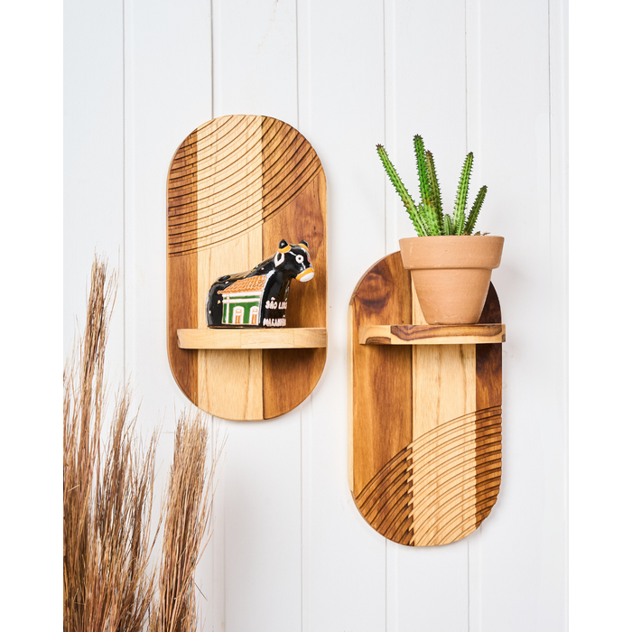 Kit com 2 prateleiras em madeira de teca maciça Detalhe entalhado com padrão curvo em baixo relevo Acabamento natural e textura única em cada peça Ideal para decoração com estilo rústico, boho ou escandinavo Feito com madeira de reflorestamento