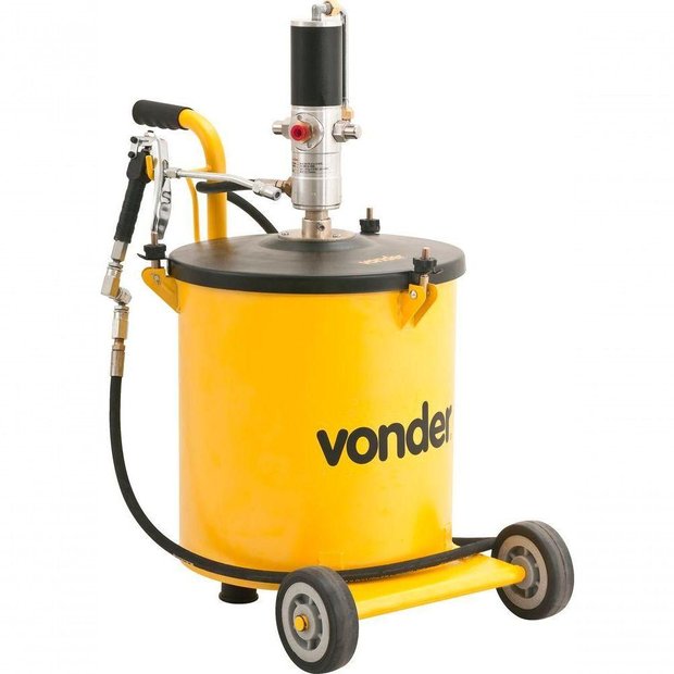 Possui duas rodas e alavanca que facilitam o transporte. Acompanha 2 metros de mangueira, conexão giratória tipo Z e válvula de controle de graxa (pistola) com extensão rígida e bico.