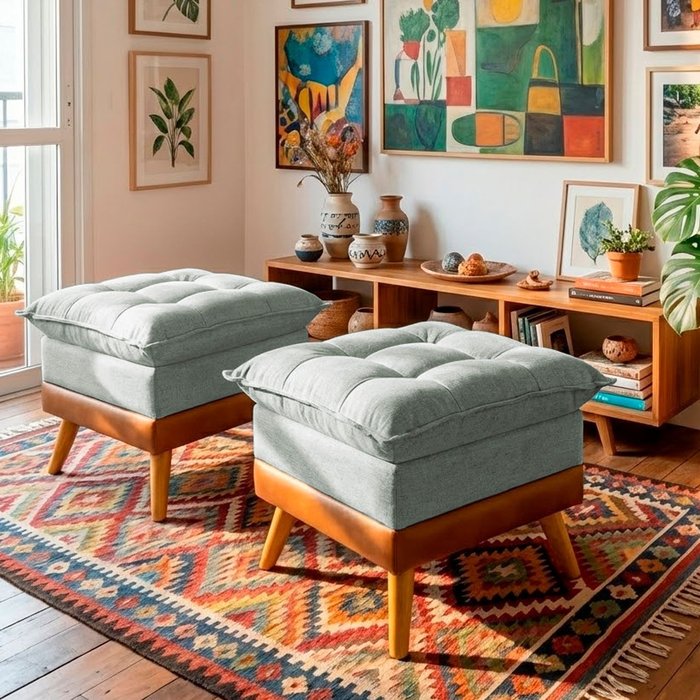 Puff Banqueta Almofadado Kit 2 Londres Apoio para Pés Corino e Linho Cinza Base de Madeira - Arkell