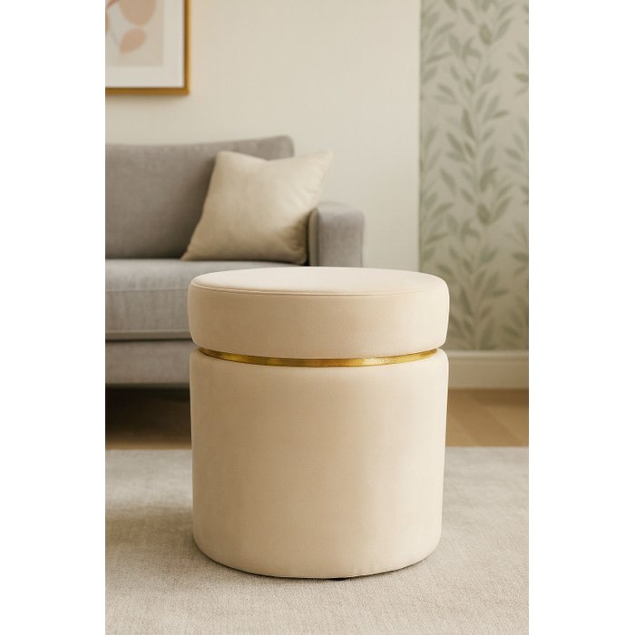 Puff Cinta Dourada Superior Palha Tecido Veludo PALHA/OFF WHITE