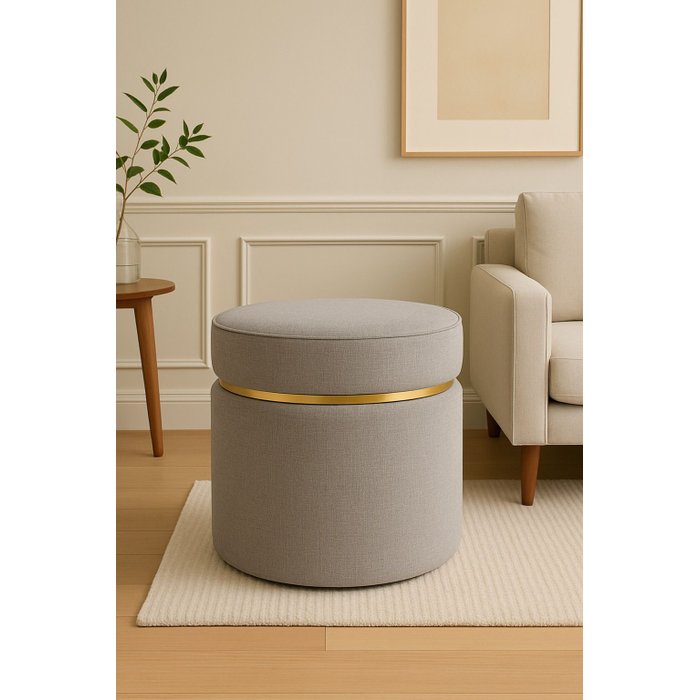 Puff com Cinta Dourada Superior Tecido de Linho CINZA