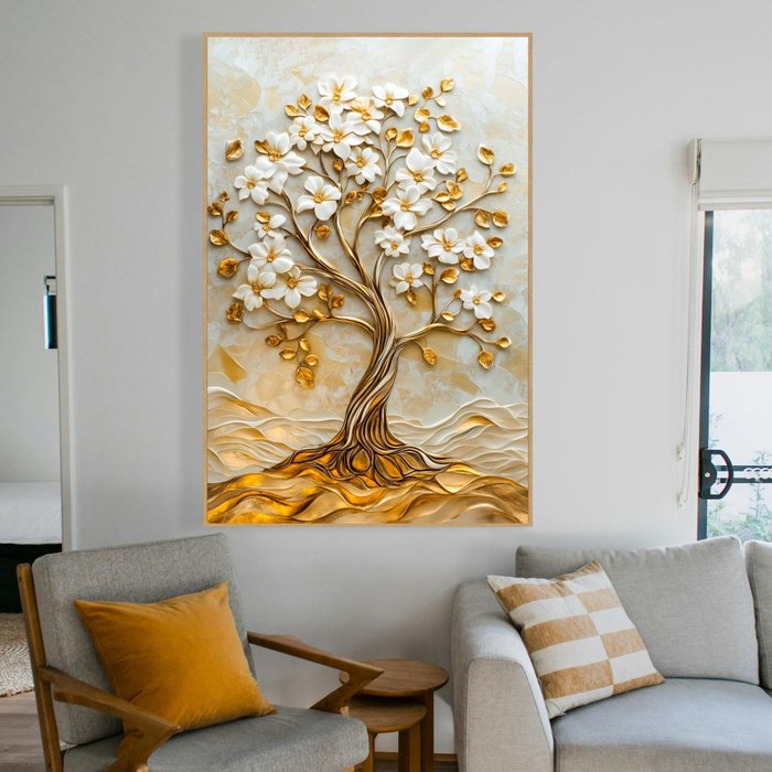 Quadro Décor Árvore 3d com Ondas Flores Brancas Folhas Douradas Sala Quarto Casa Escritório Amadeirado Claro