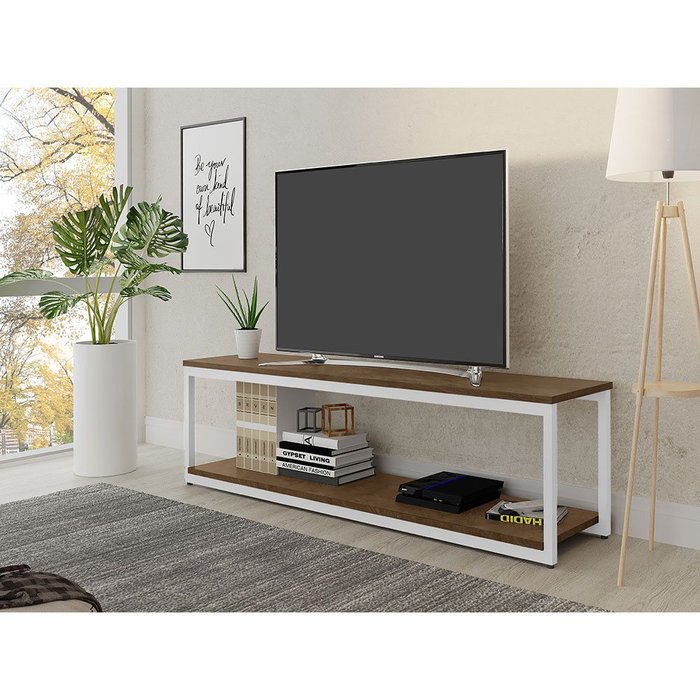 Rack estilo industrial em Aço carbono com pintura eletrostática e tampo em MDF com acabamento em pintura UV. Bordas em PVC na cor do tampo.