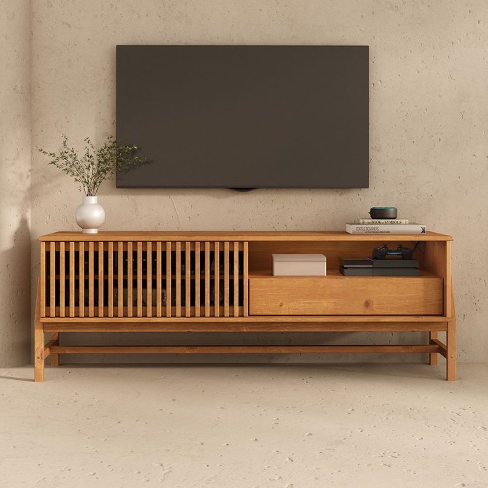 O tampo acomoda TVs de até 65”, enquanto os nichos internos amplos organizam eletrônicos e objetos decorativos de forma prática. A gaveta com corrediça telescópica e sistema de fecho-toque garante abertura suave e total, ideal para armazenar controles e acessórios.