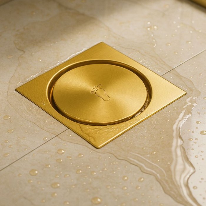 Ralo de Banheiro GoldenX – Sofisticação e Durabilidade em Dourado Escovado 10x10 com Sistema Click