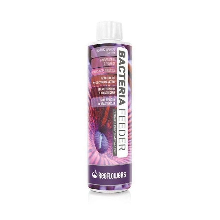 Reeflowers bacteria feeder contém variadas fontes de alimentos que facilitam o rápido crescimento de bactérias benéficas que irão contribuir com a redução de nitrato e fosfato em aquários de água doce e salgada. As bactérias irão limpar a água biologicamente, fornecendo um ambiente mais natural para os habitantes do aquário. É muito efetivo na redução dos níveis de nitrato e fosfato de aquários de água doce e salgada.