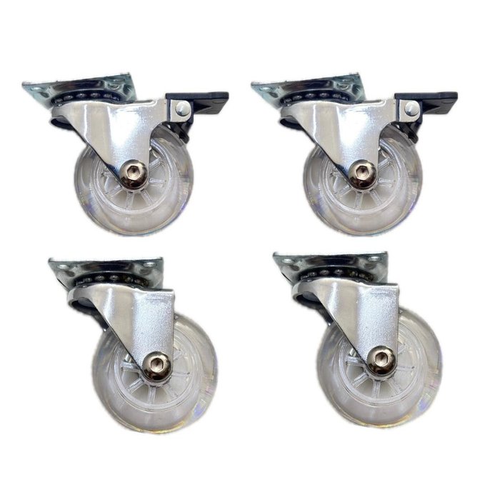 Apresentamos um conjunto de 4 rodízios de silicone transparente com design giratório, perfeitos para móveis e equipamentos que necessitam de mobilidade controlada.