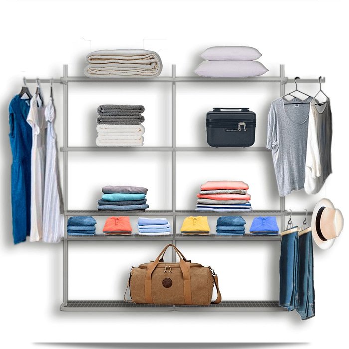 Dimensão:  2,50 x 0,52 m (LARGURA x PROFUNDIDADE)Altura recomendada: 2,35 a 2,75mDescritivo das peças que compõe o produto:Qtde    Item10    PRATELEIRA 90 x 30 CM BRANCO1    CREMALHEIRA DE 200 CM - DUPLA (c/ bucha e parafuso)2    CREMALHEIRA DE 200 CM - SIMPLES (c/ bucha e parafuso)3    BRAÇO LATERALQuantidade de peças organizadas (*):27      *roupas penduradas;    30      *pilhas de roupas dobradas com até 27cm de altura;     Vantagens dos aramados modulares:1.    Garantia de 1 ano2.    Hipoalérgicos - inibem a formação de fungos como o bolor3.    Modulável - as peças podem ser intercambiadas em módulos de mesma dimensão4.    Escalonável - possibilidade de corrigir altura entre as peças a qualquer momento sem a ajuda de ferramentas ou mão de obra especializada5.    Material - aço carbono 1020 com pintura eletrostática a pó6.    Carga - 20 kg por peçaTempo de montagem - aproximadamente 1hMaterial: Aço carbono com pintura eletrostática a póCor aramado: Branco Acompanha o pedido:- Instruções de montagem;- Buchas, engates e parafusos;- Nota fiscal.