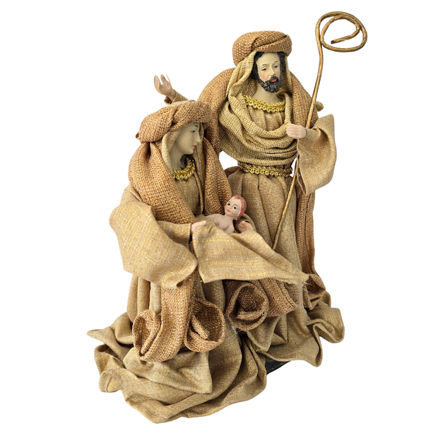 SAGRADA FAMÍLIA COM 25cm DE ALTURA, ROUPAS EM LINHO COM FIOS DOURADOS E JUTA.. MENINO JESUS, MÃOS, ROSTO, BUSTO DE MARIA E JOSÉ EM RESINA E CAJADO DE JOSÉ EM ARAME REVESTIDO.