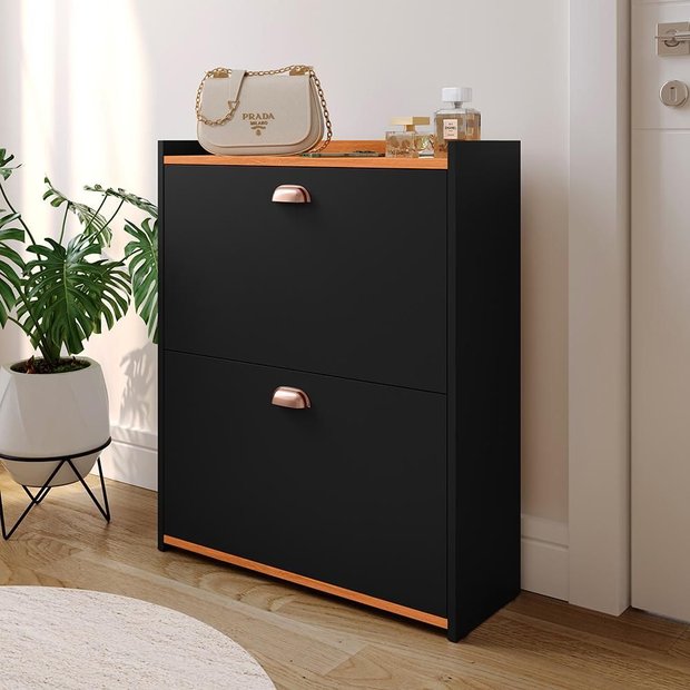 Fabricada em MDP de alta qualidade, oferece resistência e durabilidade. Conta com duas gavetas basculantes com prateleiras, ideais para armazenar até 12 pares de calçados, mantendo tudo organizado e harmonioso.