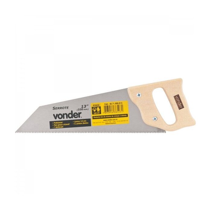 | Informações Complementares | Material da lâmina do serrote: Lâmina de aço temperado / Material do cabo do serrote: Madeira / Comprimento de corte do serrote: 13" - 330 mm / Número de dentes por polegada: 7 dentes |