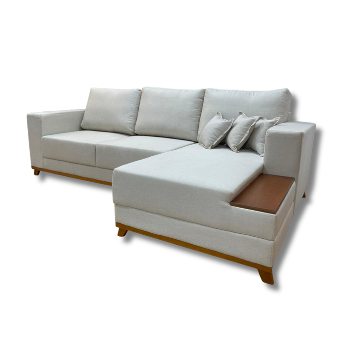 Nosso Sofá 3 lugares Bege modelo Aline é um produto moderno, com design elegante que deixa sua sala ainda mais linda e aconchegante. Bem como seu Chaise com amplo espaço, ideal para esticar as pernas e descansar. Ainda mais com o revestimento em Linho com textura macia, considerada confortável e sofisticada para o revestimento de estofados. Além do detalhe em madeira ideal para repousar copos, controle remotos e outros objetos. Então, compre agora seu sofá Chaise Aline.