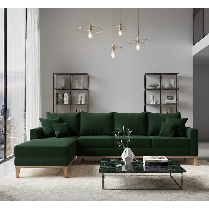 Sofá Beny com Chaise Esquerda, 1,40x2,60m, 4 Lugares, Linho, Base em Madeira. Verde